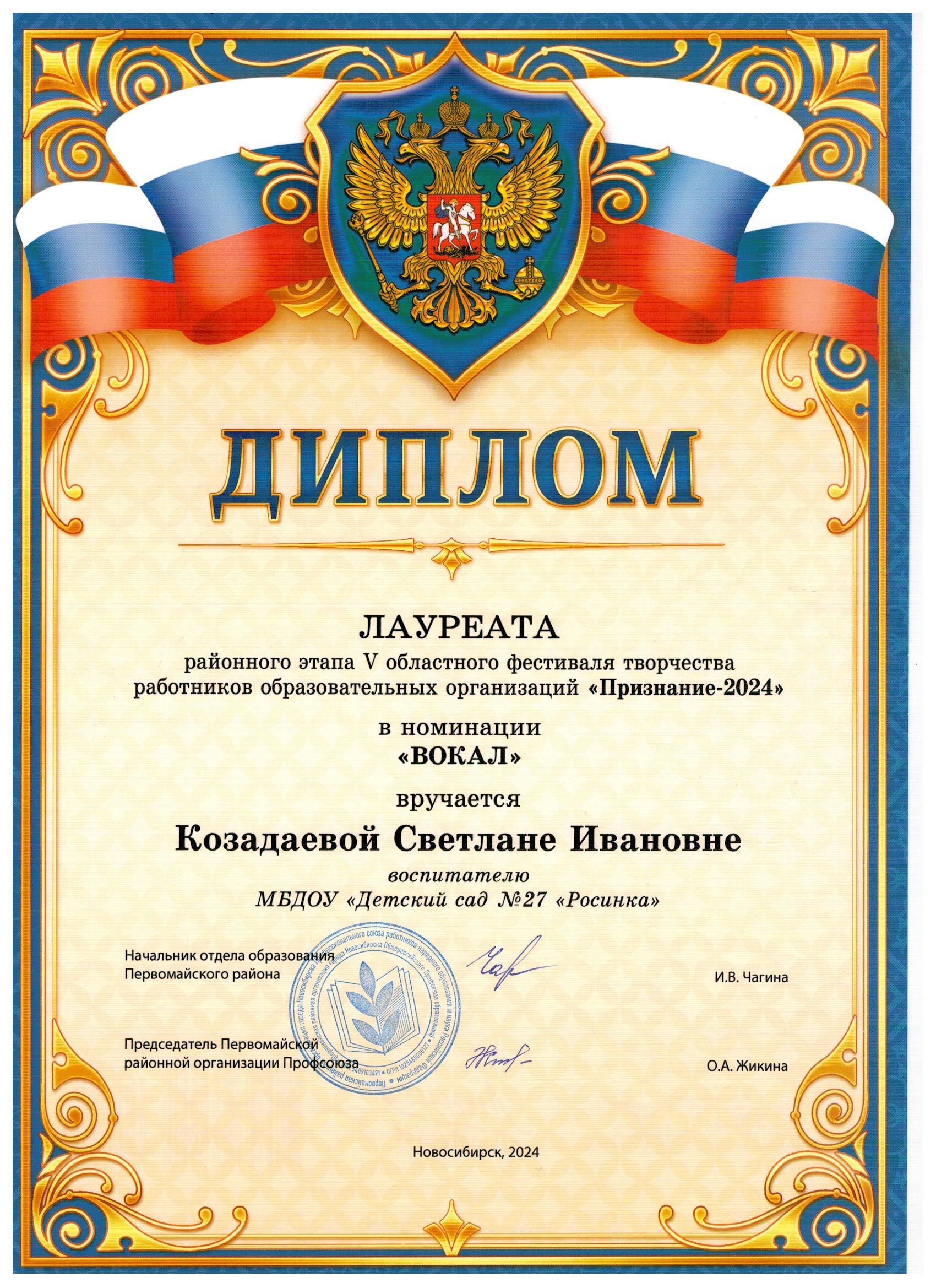 Диплом лауреата фестиваля "Признание-2024"