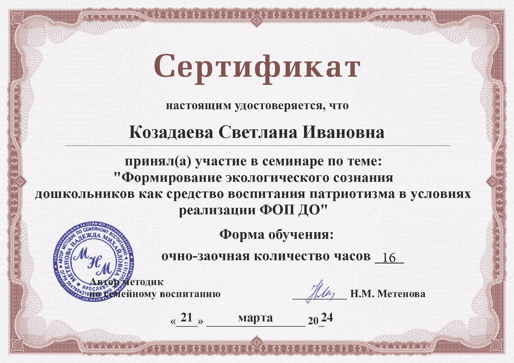 Сертификат участника семинара Формирование экологического сознания
